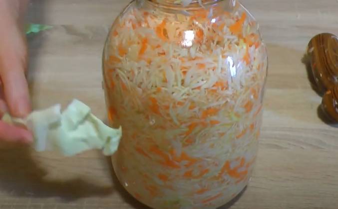 2. Хорошо утрамбовываю капусту в банку, сверху закрывает пелюстками, банку с капустой до краев не наполняю, если банку наполнить до краев, выделившийся капустный сок начнет вытекать из банки. капуста сразу начинает выделять сок, вот смотрите квасится капуста будет четыре дня, каждый день я буду прокалывать ее деревянной палочкой, чтобы выходил углекислый газ и капуста не приобрела неприятный запах.