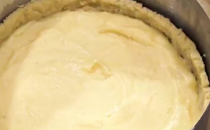 3. Вернуть массу в сотейник и проварить на среднем огне до загустения. Масса будет густая, в конце станет похожа на большой комок, так и должно быть. Когда это произошло, снимаем с огня, наливаем 50 гр.сливок, пробиваем блендером. Выкладываем крем в основу и ставим в разогретую духовку (те же 180 гр) на 5-7 мин. Достаём из духовки, чуть остужаем, минут 15. Аккуратно на крем выкладываем ложкой вишню.