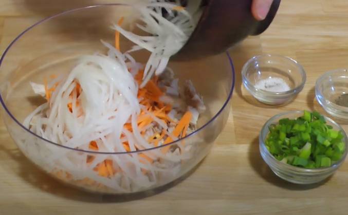 2. Морковь и дайкон нужно натереть на терке для корейской моркови, 2 яйца 3 столовых ложки измельченного зеленого лука, соль и перец по вкусу.