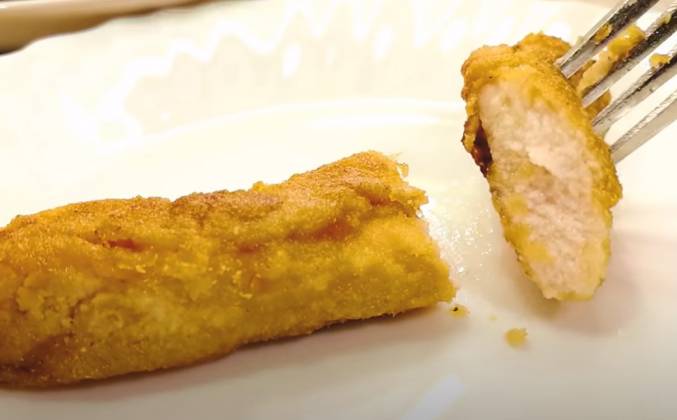 2. наливаем немного растительного масла, каждый кусочек достаем из маринада, обваливаем в кукурузной муке, лучше всего взять кукурузную муку, она такая золотистая получается, хрустящая, но если кукурузной муки нету, можно взять и обычную, выкладываем на сковородку и обжариваем с двух сторон до румяной корочки, как только кусочки куриной грудки подзолотятся, мы переворачиваем, куриная грудка сама по себе готовится очень быстро, а промаринованная еще быстрее.
