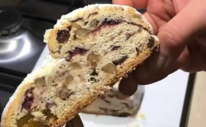 2. Должно получиться мягкое тесто. В тесто вмешать все цукаты (заранее цукаты перемешать с 2 ст.л муки).Тесто делим на 2части, из каждой части формируем штоллен!