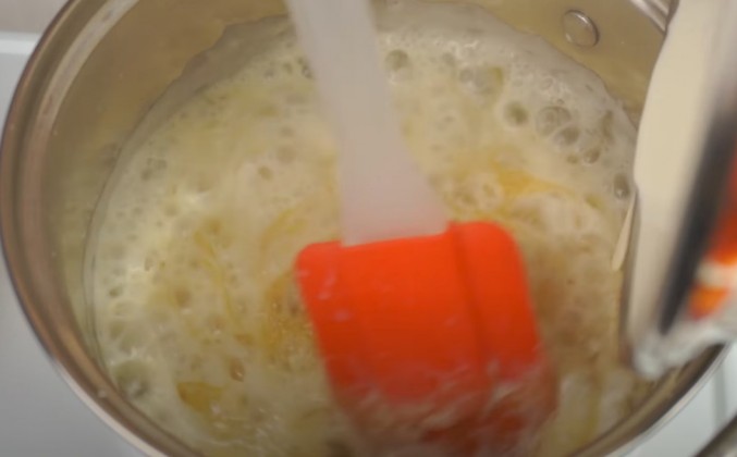 2. Как только карамель приобретет нужный цвет, добавляем в нее теплые сливки и непрерывно перемешиваем. Перемешивать карамель нужно деревянной или силиконовой лопаткой. Железную ложку использовать нельзя, так как из за разницы температур... карамель может кристаллизироваться. Снимаем с огня. Как только смесь перестала бурлить, добавляем в нее сливочное масло комнатной температуры.