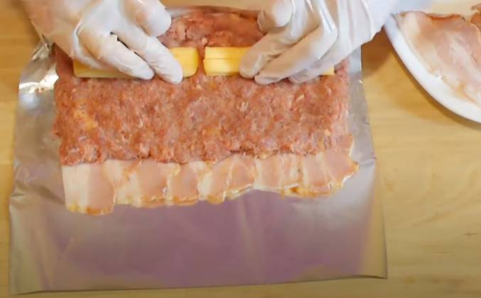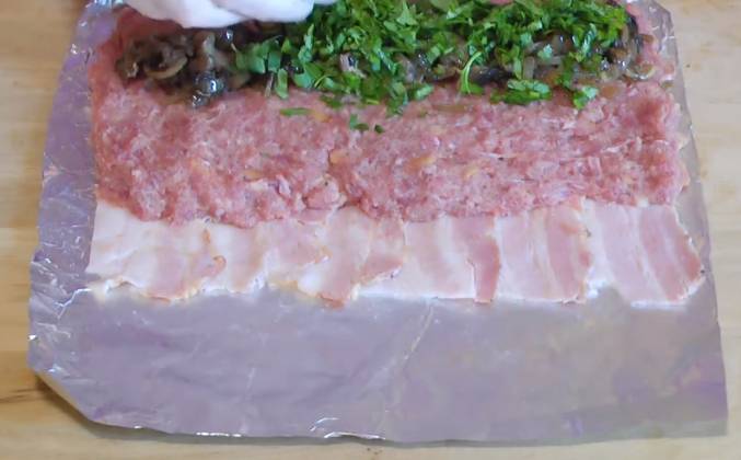 2. Второй слой выкладывают внахлест к первому сверху выкладываю фарш. Чтобы не потерять рецепт подписывайтесь на канал и смотрите другие мои видео. Равномерно распределяю его по грудинке. Толщина слоя приблизительно 1 сантиметр. От края оставляю два сантиметра. Выкладываю начинку. Один рулет я буду делать с сыром. Второй с грибами и зеленью. И с помощью фольги заворачиваю. Перекладываю мясной рулет из фарша в форму для запекания. Второй рулет делаю с грибами и зеленью Если понравилось видео, поддержите меня лайком, делитесь этим видео с друзьями и подписывайтесь.