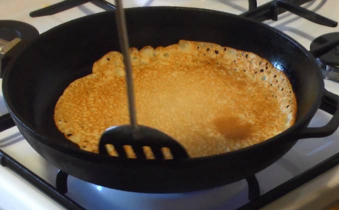 2. Чем дольше тесто будет стоять, тем сильнее оно поднимется и блин получится толще. Хорошо нагреваем сковороду. Перед первым блином смазываем растительным маслом или салом. Первый блин не спешите переворачивать, дайте ему хорошо пропечься. Если блины рвутся, значит мало муки. Добавьте дополнительно одну столовую ложку.