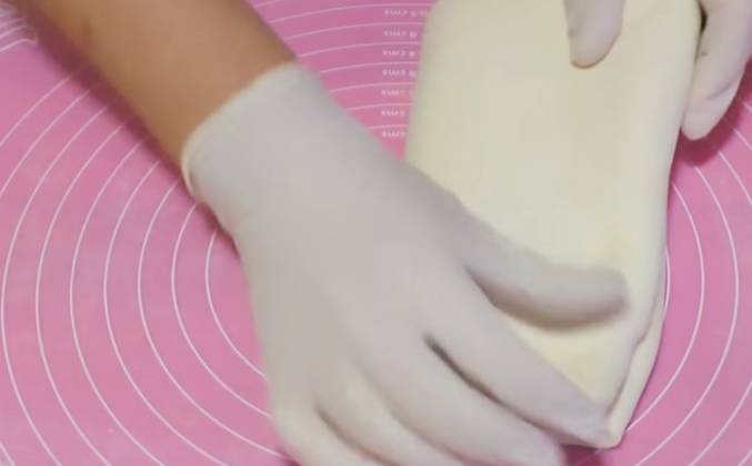 3. Лишнюю муку нужно стряхнуть, чтобы она не мешала слоям слипаться между собой. Складываем тесто вчетверо. Сейчас в этом тесте четыре слоя масла и 8 слоев теста. Заворачиваем в пергамент. Оставляем охлаждаться в холодильнике на 30 минут. Охлажденное тесто перед раскаткой оставляем полежать 5-10 минут при комнатной температуре. Подпыливаем мукой и аккуратно раскатываем прямоугольник толщиной 5-7 миллиметров. Лишнюю муку нужно стряхнуть, чтобы она не мешала слоям слипаться между собой. Складываем тесто вчетверо. Сейчас в тесте 16 слоев масла и 32 слоя теста. Для дрожжевого слоеного теста этого количества слоев достаточно. Заворачиваем в пергамент и оставляем в холодильнике на один-два часа. Через два часа слоеное тесто готово для выпечки.