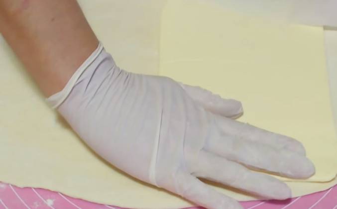 2. После того как тесто поднялось, присыпаем его мукой и раскатываем в прямоугольник толщиной 5-7 миллиметров. Размер прямоугольника по ширине должен быть в два раза больше масляного конверта. Чтобы тесто не порвалось и не прилипало к скалке или столу, присыпаем периодически его мукой. Выкладываем холодное масло на одну сторону прямоугольника и накрываем его второй стороной теста. Запечатываем края. Раскатываем тесто в прямоугольник толщиной 5-7 миллиметров. В этом прямоугольнике один слой масла и 2 слоя теста. Не забываем тесто присыпать мукой иначе верхний слой может порваться.