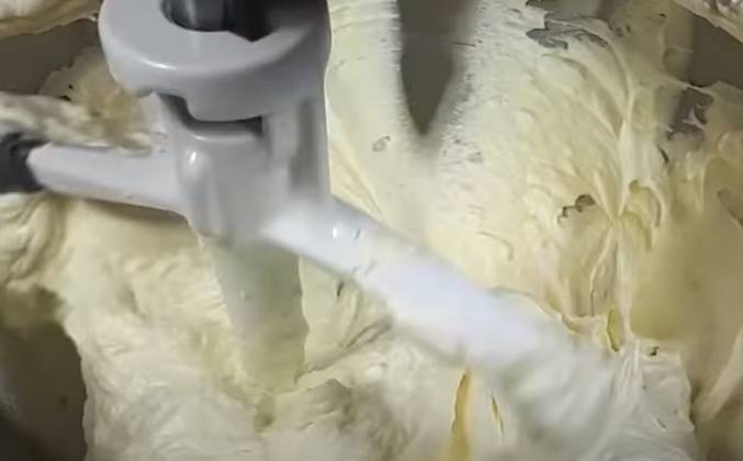 2. Следующим шагом отправляем в дежу миксера мягкое сливочное масло, сахарную пудру, щепотку ванилина и взбиваем добела минут 7 (я для этого использую насадку лопатка). Чтобы ингредиенты объединились начинаем взбивать на небольшой скорости и постепенно доводим до максимальной. Сливочное масло выбирайте самое качественное, самой высокой жирностью, в составе должны быть только сливки. Когда масса стала белой и пышной, понемногу, буквально по одной столовой ложке, добавляем творог и перемешиваем на самых минимальных оборотах до объединения ингредиентов (также можно объединить просто при помощи силиконовой лопатки).