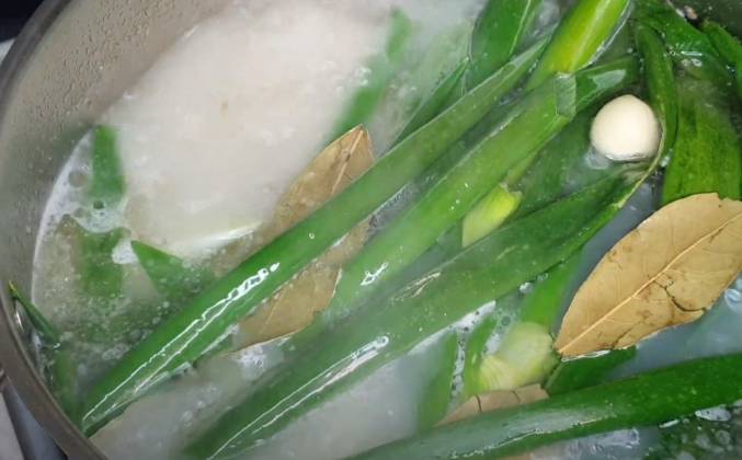 2. Добавляем мясо (у нас ножная часть с прожилками), отмочив предварительно два часа в холодной воде. Варим мясо 1.5 часа. Бульон процеживаем два раза. Мясо режем тонкими пластинами Отварим лапшу куксу Разливаем бульон по среднего размера чашкам, добавляем несколько кусочков мяса, немного лапши и зеленый лук или лук порей. Можно сделать подачу очень горячего супа.