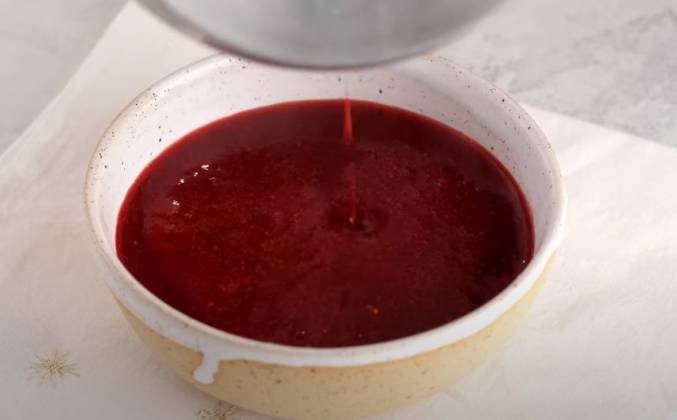 3. После остывания присыпьте половину печенья (фигурные) сахарной пудрой. Приготовить малиновый ДЖЕМ можно заранее, а можно использовать и другой джем который у вас есть. Нагрейте малиновое пюре (150 гр) до 40 С. Пока пюре нагревается, перемешайте сахар (75 гр) с пектином (5 гр). Помешивая пюре засыпьте сахар с пектином. Постоянно помешивая джем доведите до кипения и варите 2 минуты.
