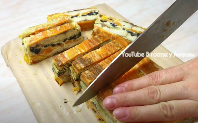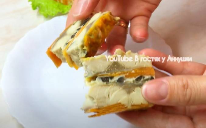 4. Готовность проверяю достав кусочек моркови с середины. Если морковь мягкая значит все готово. Закуску оставляю на столе, после остывание убираю в холодильник на несколько часов. Эту закуску можно приготовить днём ранее, и достать уже, перед подачей на стол это очень удобно. Закуска очень хорошо нарезается главное не давить ножом, резать очень острым ножом, и резать распиливающими движениями.Видео рецепт ютуб ниже 👇