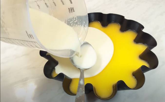 3. желатин уже набух отправляем его в микроволновку или на водяную баню и прогреваем до жидкого состояния но не кипятим температура желатина не должна превышать 60 градусов сахар в сливках полностью растворился осталось еще раз хорошенько перемешать постепенно тонкой струйкой выливаем распущенный желатин в апельсиновый сок и в сливки при этом постоянно перемешивая очень важно чтобы и сок и сливки были комнатной температуры но ни в коем случае не холодными иначе распущенный желатин при попадании в холодную среду сразу схватиться комочками готовить я буду в форме для кекса объемом тысяча семьсот миллилитров а вы берите подходящую форму которая есть у вас я ее слегка смазала рафинированным растительным маслом без запаха при желании можно выстелить пищевой пленкой так вам будет ещё легче извлечь готовый торт если вы будете готовить в силиконовой форме то это делать не обязательно сначала заливаем сливочное желе тонким слоем и убираем в морозильную камеру буквально на пять минут но не дольше чтобы оно хорошо схватилось но не замерзло если вы знаете что вас могут в любой момент отвлечь что лучше поставьте для застывания в холодильник но с морозилкой процесс двигается гораздо быстрее.