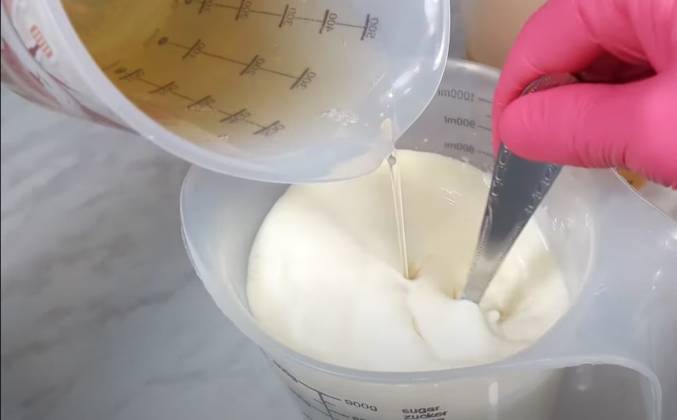 2. Желатин уже набух отправляем его в микроволновку или на водяную баню и прогреваем до жидкого состояния но не кипятим температура желатина не должна превышать 60 градусов сахар в сливках полностью растворился осталось еще раз хорошенько перемешать постепенно тонкой струйкой выливаем распущенный желатин в апельсиновый сок и в сливки при этом постоянно перемешивая очень важно чтобы и сок и сливки были комнатной температуры но ни в коем случае не холодными иначе распущенный желатин при попадании в холодную среду сразу схватиться комочками готовить я буду в форме для кекса объемом тысяча семьсот миллилитров а вы берите подходящую форму которая есть у вас я ее слегка смазала рафинированным растительным маслом без запаха при желании можно выстелить пищевой пленкой так вам будет ещё легче извлечь готовый торт если вы будете готовить в силиконовой форме то это делать не обязательно .