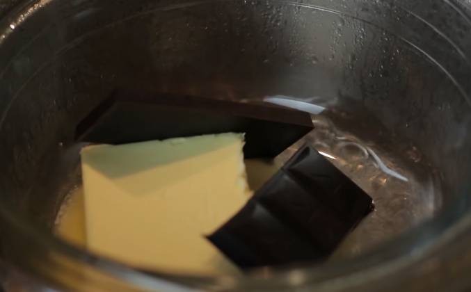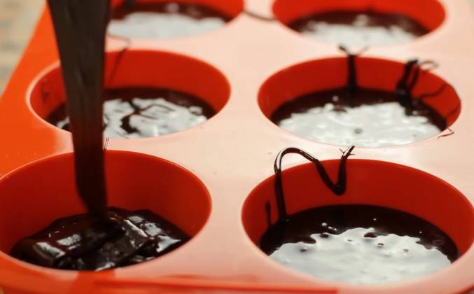2. Вмешиваем сюда шоколад с маслом. Хорошо все смешиваем и добавляем муку. Высыпаем и также хорошо перемешиваем. Наша смесь для фондана готова! Оставим её на 30 минут для того, чтобы она стала нужной консистенции. Ставим духовку разогреваться до 180 градусов. Смесь наша настоялась. Сейчас разольем по формочкам и поставим в духовку, примерно на 12 минут. Шоколадный фондан готов! Он так и просится чтобы его уже скорее съели! Он весь течет и полыхает))