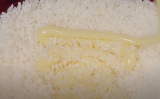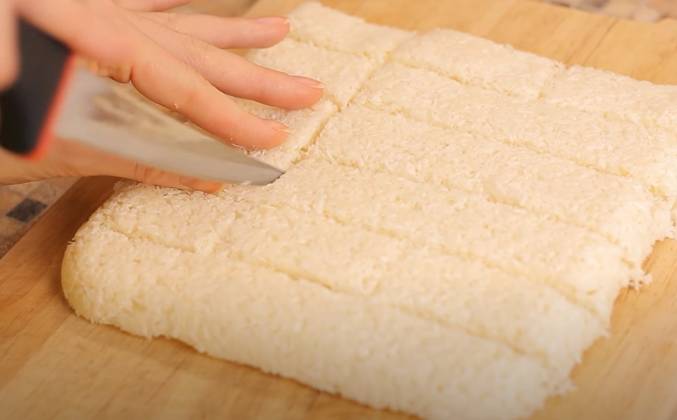 2. Теперь равномерно распределим и примнем. Наша начинка должна быть толщиной не более 3-х сантиметров. Иначе, у нас получится супер большой баунти. Накрываем пищевой пленкой. И ставим в морозильную камеру на 1 час. Теперь достаем нашу начинку для того, чтобы переместить на разделочную доску и разделать по кусочкам. Очень аккуратно делаем, чтобы у нас все осталось целым. Нарезаем по кусочкам. Размером: 3 х 6 см. Т.е. 3 см в ширину, 6 см в длину. Теперь закруглим с помощью большого пальца нашу конфету, чтобы она больше походила на баунти.