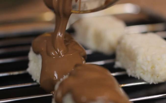 3. Теперь нам нужно шоколад растопить на водяной бане. Для этого нальем воду в кастрюлю и поставим на огонь. Ставим глубокую тарелку. И сверху выкладываем шоколад. Пошло дело. Шоколад топится. Теперь для того, чтобы нам нашу начинку полить шоколадом возьмем обычный лист для выпекания и сверху решетку из духовки. Поставим и сверху выложим нашу начинку. Поливаем шоколадом наши конфетки. Домашнее баунти готово! Как Вы увидели, ничего сложного здесь нет, зато как приятно кушать конфетки своего приготовления! Скорее наливайте чаек и кушайте свое творение. Приятного аппетита!Видео рецепт ютуб ниже 👇